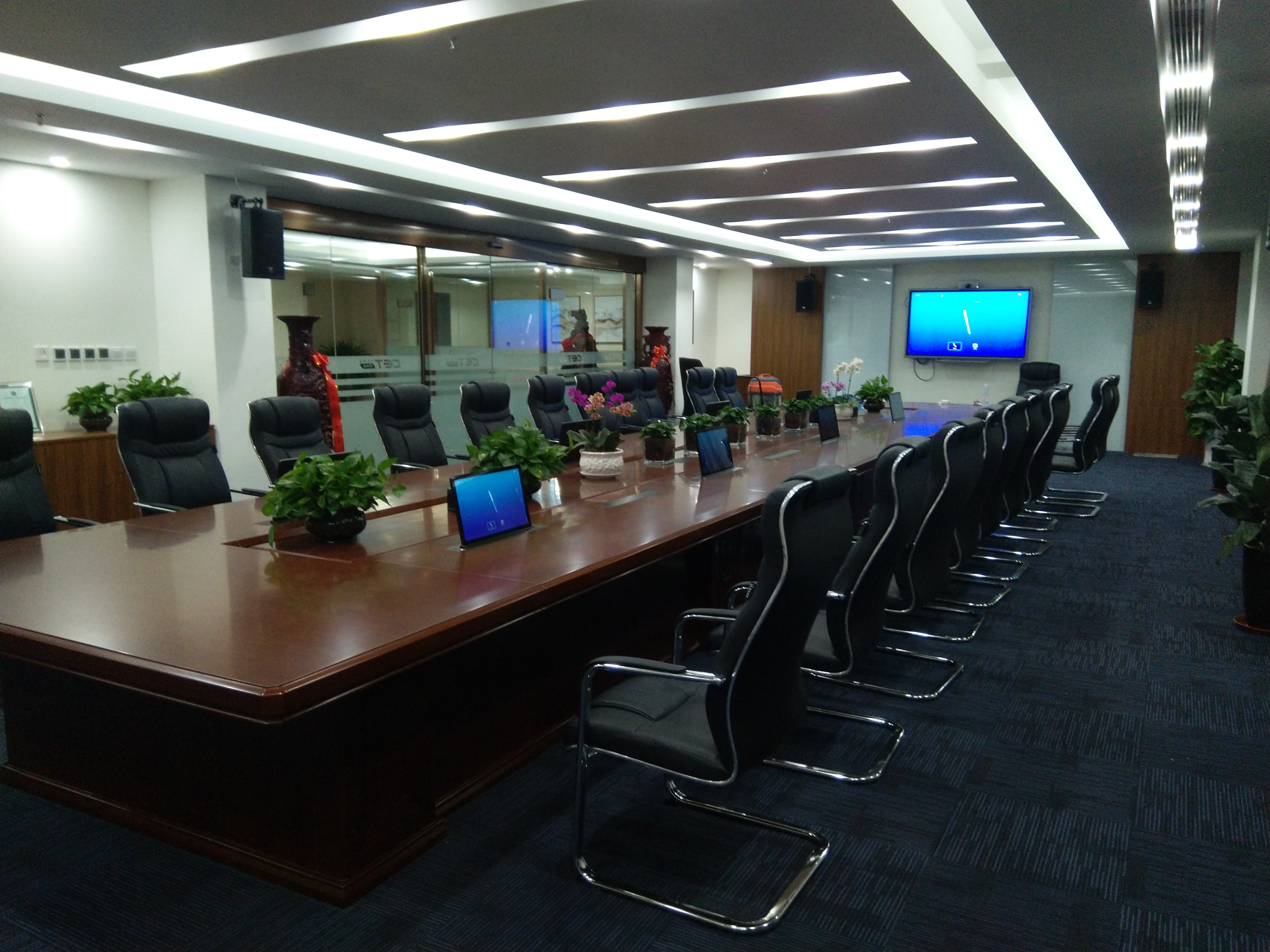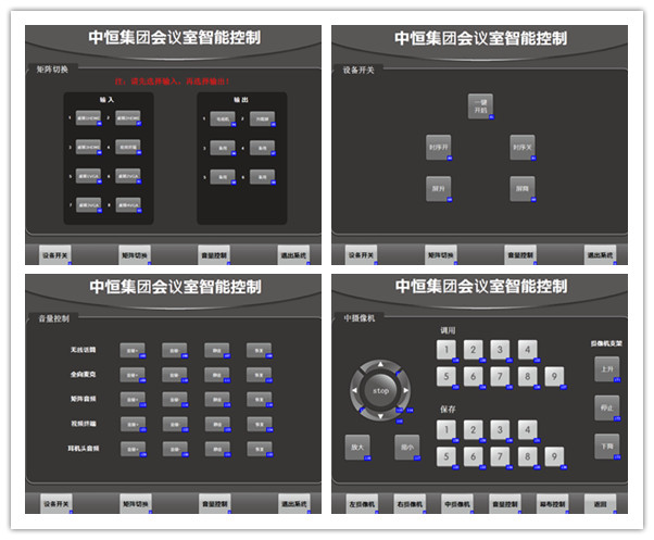 圓桌會議室擴聲部分采用4只8寸全頻揚聲器作為會場擴聲;發(fā)言部分配置1套無線手持話筒,視頻會議使用終端配套全向麥克風。顯示部分配置一臺大尺寸交互式一體機,結(jié)合插卡式高清混合矩陣,可實現(xiàn)多種類、多數(shù)量視頻信號切換至不同顯示設(shè)備顯示。為使操作更簡便化,配置一臺集中控制系統(tǒng),通過平板實現(xiàn)對設(shè)備開關(guān)、信號切換和音量大小的智能控制。作為高層領(lǐng)導會議,為體現(xiàn)會場高端大氣,配置一套無紙化會議系統(tǒng),超薄升降屏,會議進程無紙化,會議資料全電子檔各坐席可查看,各坐席可同屏討論,投票表決,實時查看。