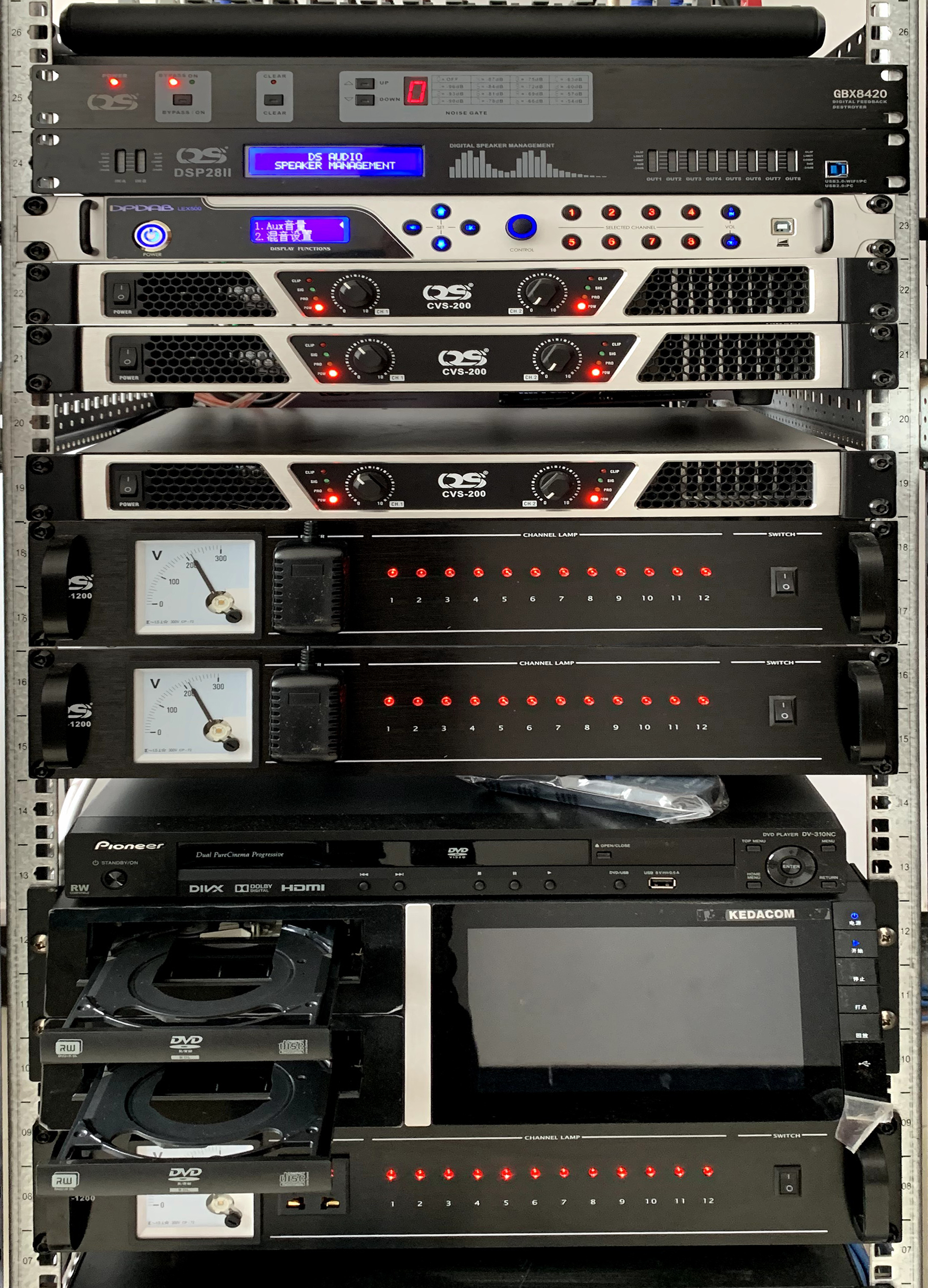 擴(kuò)聲系統(tǒng)的擺位設(shè)計(jì),迪賽思技術(shù)團(tuán)隊(duì)進(jìn)行了周密的計(jì)劃:在進(jìn)行演繹類擴(kuò)聲項(xiàng)目擺位設(shè)計(jì)時,盡可能地滿足了聲音方向的一致性。按照集中式擴(kuò)聲原則,需讓最后一排觀眾席的觀眾與主場觀眾所得到的總聲壓級相差值可控于6dB以內(nèi)。由于點(diǎn)聲源擴(kuò)聲的衰減特性,經(jīng)過計(jì)算,得出補(bǔ)聲揚(yáng)聲器的安裝位置。以接力補(bǔ)聲的方式進(jìn)行主擴(kuò)傳遞工作。