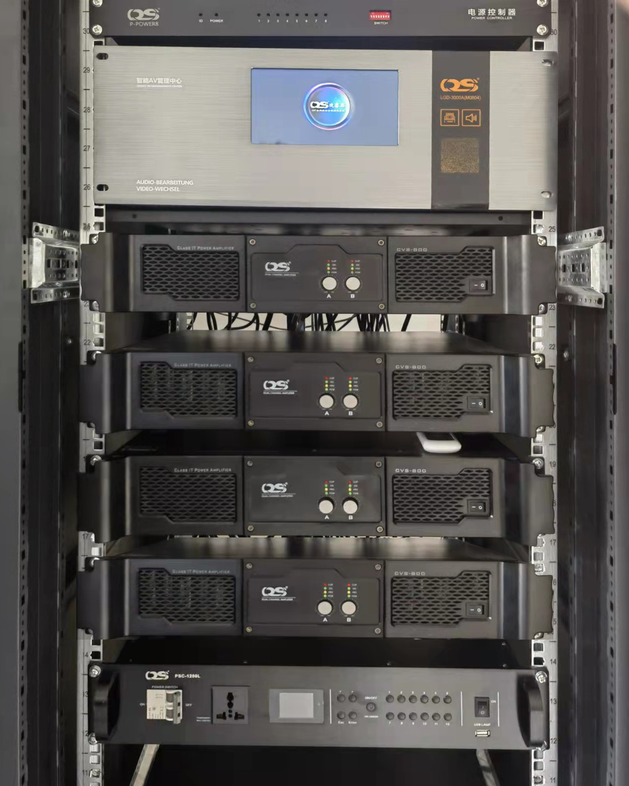 經(jīng)過現(xiàn)場(chǎng)測(cè)量,現(xiàn)場(chǎng)工程師對(duì)補(bǔ)聲揚(yáng)聲器做了合理的延時(shí)處理,音箱采用兩只主擴(kuò),四只輔助,兩只返聽做到聲音從一致方向傳來(lái),極大地降低了相位失真。讓該音頻系統(tǒng)動(dòng)力穩(wěn)定充沛,擴(kuò)聲純凈無(wú)干擾,無(wú)論會(huì)議還是影視觀賞及活動(dòng)演出,都能得到音質(zhì)清晰自然,音頻飽滿的擴(kuò)聲。